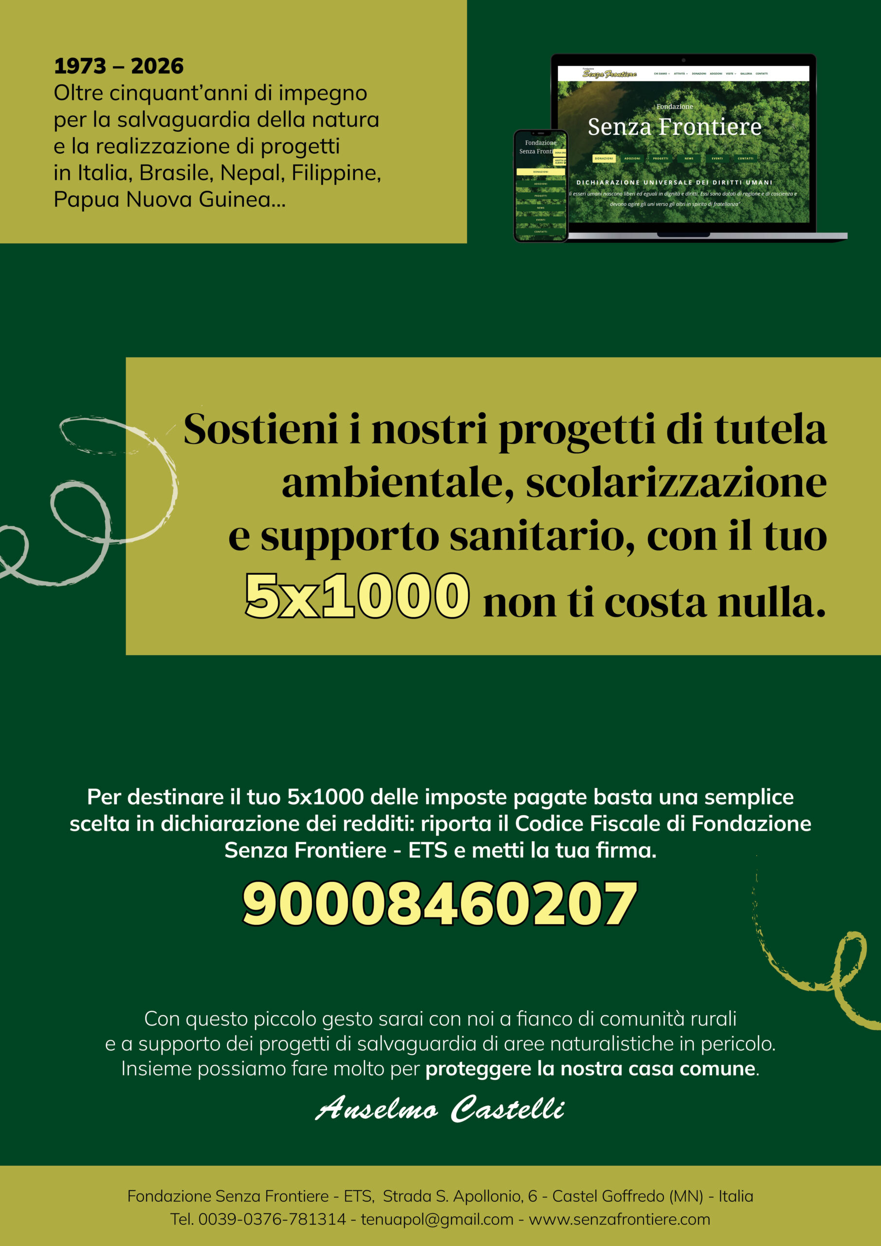 Per continuare a sostenere la nostra missione con un gesto semplice e gratuito, dona il 5×1000 alla Fondazione Senza Frontiere.